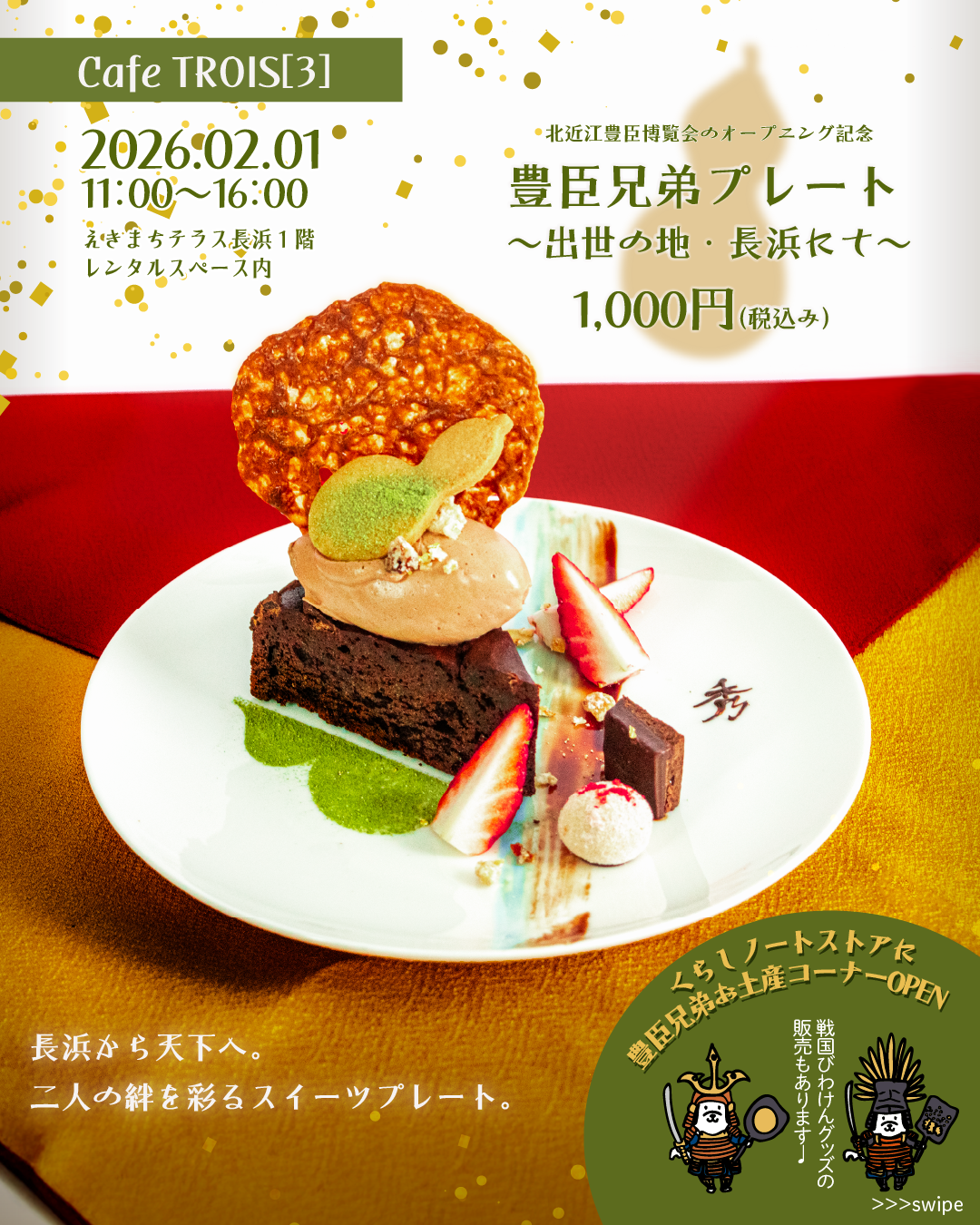 長浜市内のパティシエTROIS「3」(トロワ)による豊臣兄弟の絆を味わうスイーツプレート「豊臣兄弟プレート」の販売や戦国びわけんグッズの販売などを行うほか、ゆるキャラ「びわけん」も応援に来てくれます。